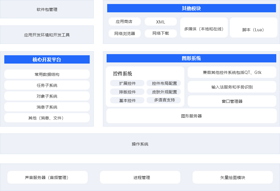 復雜的應用場景轉換、有效的嵌入式運行環境有足夠強大的圖形服務器、窗口管理器、軟件包管理器、進程管理器等支持應對。